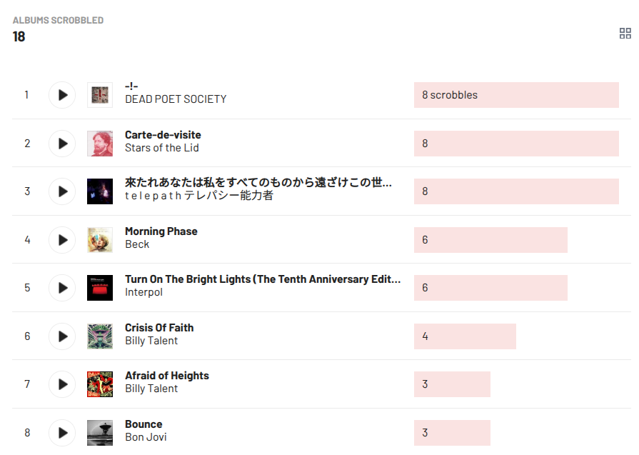 這禮拜不知為啥,突然想起高中超愛的兩個樂團:Billy Talent 和 DEAD POET SOCIETY。我還記得那時每天搭校車回家,都會從頭到尾完整聽完 Billy Talent 的專輯。我也記得大學放榜、確定錄取的那天,我整天在外面散步,回程時將 DEAD POET SOCIETY 的所有專輯全都聽了一遍。啊對!還有 Logic!我高中超愛他的《Under Pressure》這張專輯