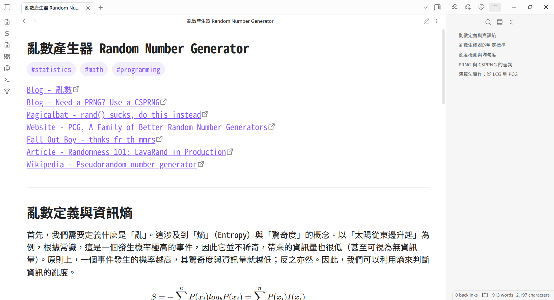 因為現在記錄頻率大幅提升,我也找到了一套新的記錄方式(雖然我以前其實也沒有特定的記錄習慣就是了)。現在我都會鎖定一個主題(例如「亂數產生器」)然後加上標籤,然後開始找一堆參考資料與閱讀內容。等研究告一段落後,我會把有用的資料都貼上去,之後再對著 GPT 的語音辨識功能狂噴猛噴我現在的理解、已掌握的知識和還不清楚的地方。接著就像上面說的,我會丟給轉錄稿轉換器潤飾。