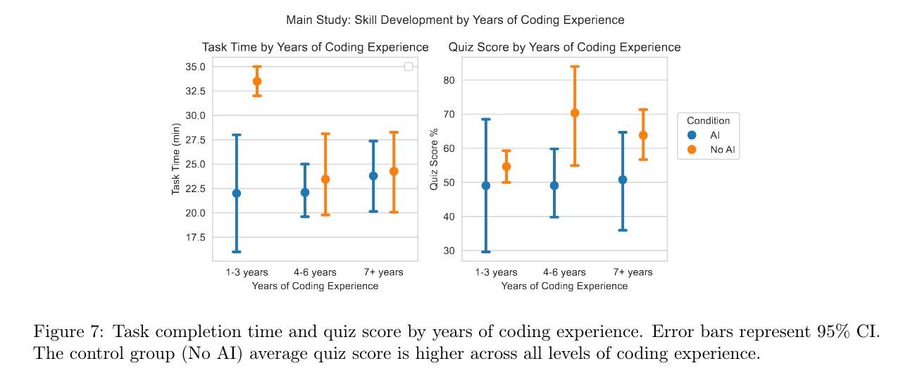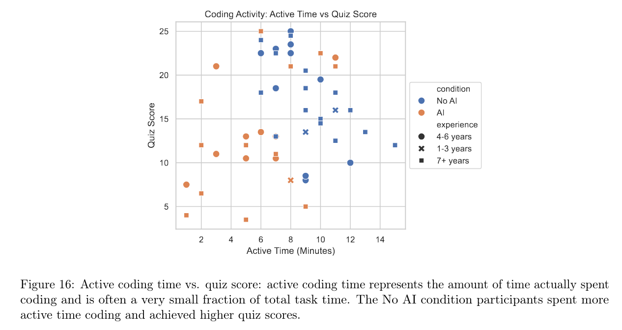根據下面圖表可以看出,對於只有 1-3 年經驗的菜鳥,有無 AI 輔助確實會影響花費的時間,且不用 AI 對於理解還不見得有幫助(雖然 1-3 年經驗的樣本數只有兩人)。不過更明顯的是,只要有點經驗的程式設計師,用 AI 的提昇也沒有很明顯,而不用 AI 的組別測驗分數卻明顯要更高。